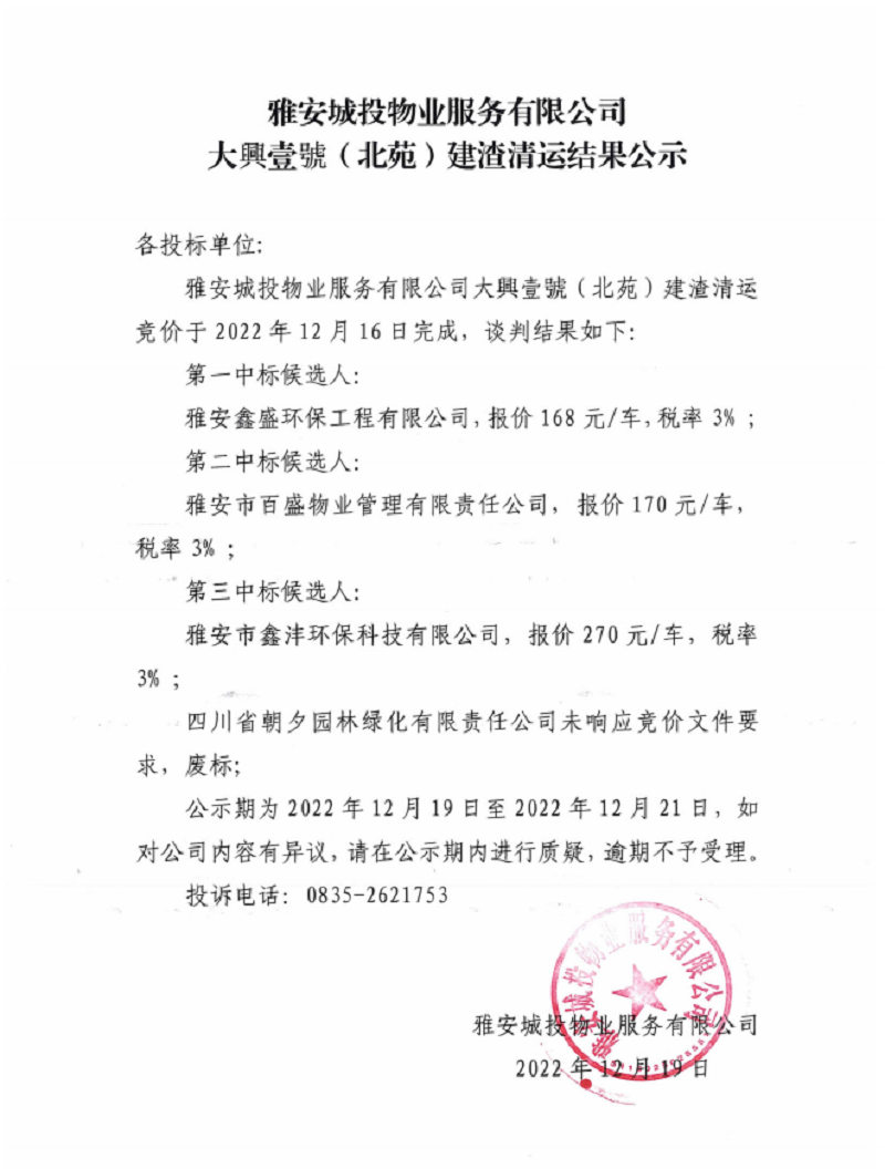 雅安城投物業(yè)服務(wù)有限公司大興壹號(北苑)建渣清運結(jié)果公示