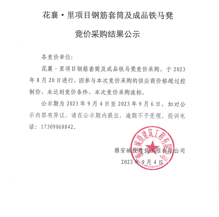 花襄·里鋼筋套筒及成品鐵馬凳競(jìng)價(jià)采購結(jié)果公示