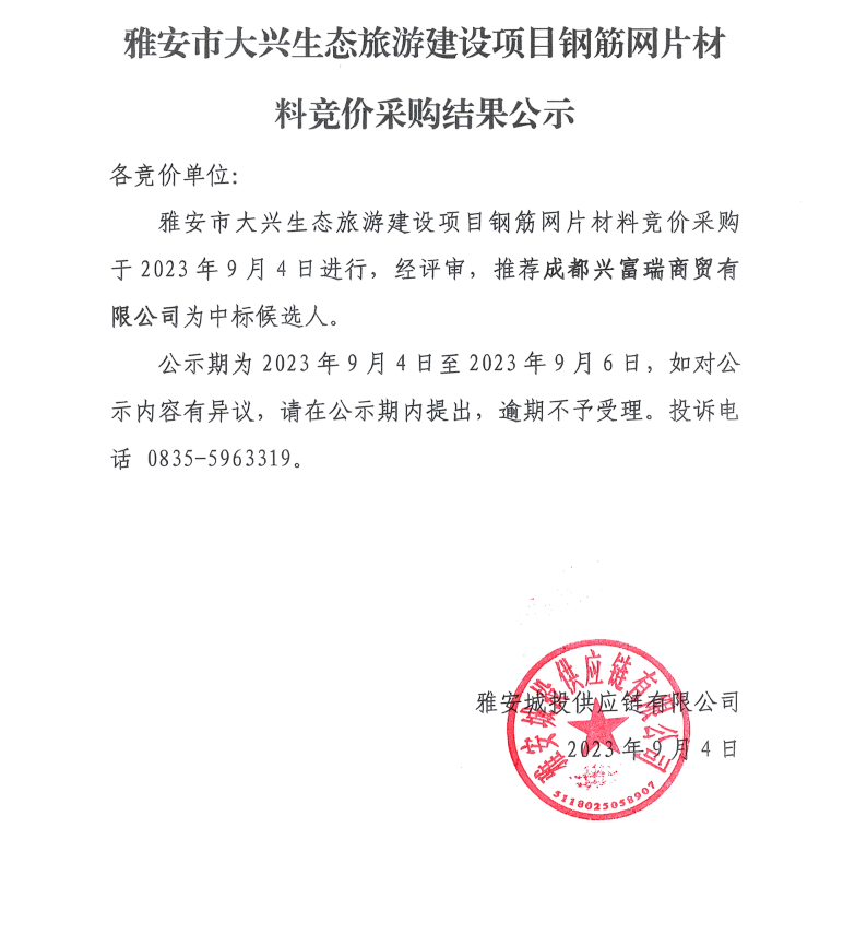 雅安市大興生態(tài)旅游建設(shè)項(xiàng)目鋼筋網(wǎng)片材料競價采購結(jié)果公示