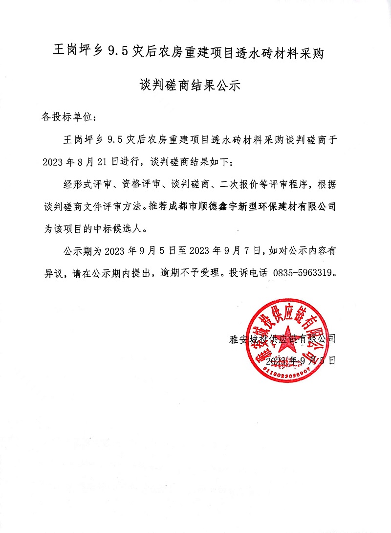 王崗坪鄉(xiāng)9.5災后農(nóng)房重建項目透水磚材料采購談判磋商結果公示