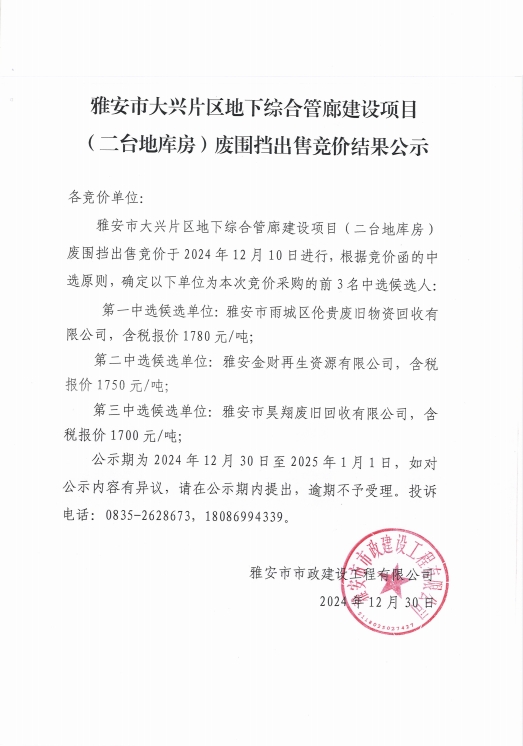 雅安市大興片區(qū)地下綜合管廊建設項目 (二臺地庫房)廢圍擋出售竟價結果公示