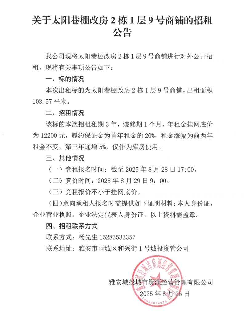 關(guān)于太陽巷棚改房2棟1層9號(hào)商鋪的招租公告