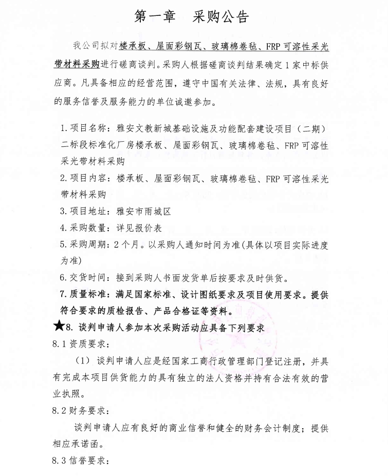 雅安文教新城基礎(chǔ)設(shè)施及功能配套建設(shè)項(xiàng)目(二期)二標(biāo)段標(biāo)準(zhǔn)化廠房樓承板、屋面彩鋼瓦、玻璃棉卷氈、FRP可溶性采光帶材料采購公告