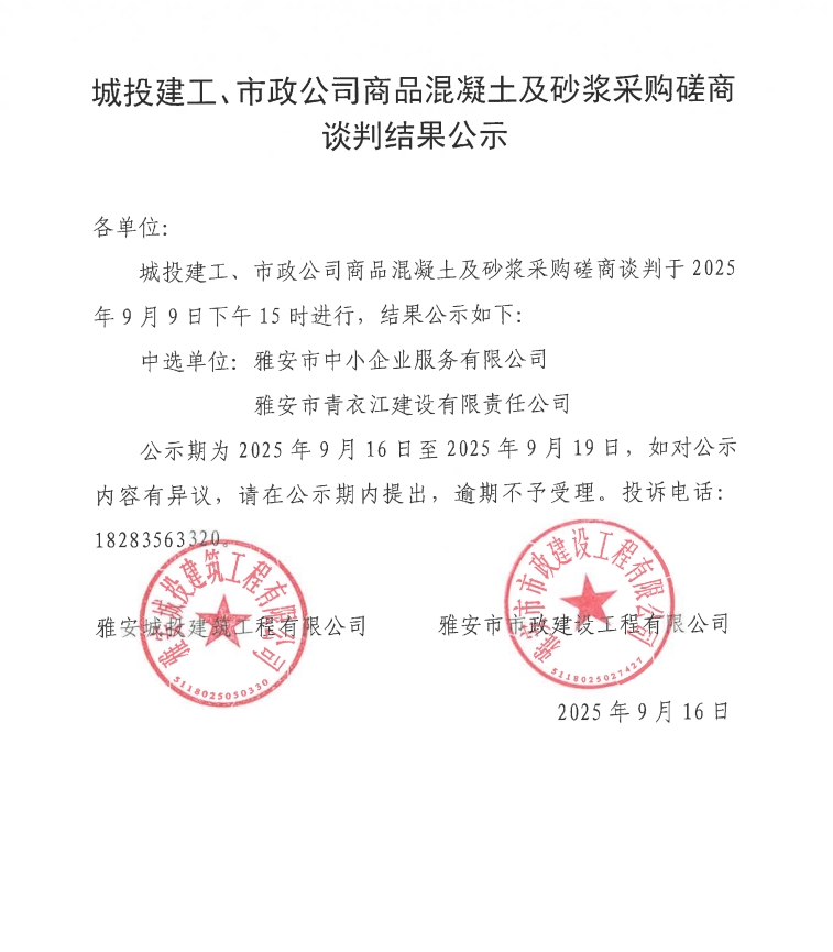 城投建工、市政公司商品混凝土及砂漿采購磋商談判結果公示